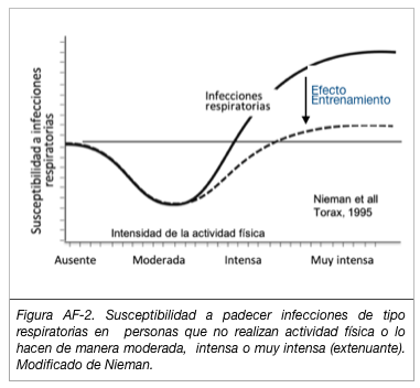 Esto ha sido ratificado por la sabiduría popular, que opina “si mucho caminas de gripe no morirás” pero también científicamente por innumerables trabajos científicos. Entre ellos, destacamos los realizados por David C. Nieman de la University Boone, USA, pionero en estos estudios. Él y su equipo analizaron en un gran número de personas la frecuencia con la cual padecían infecciones, al mismo tiempo que estudió el estado funcional del sistema inmune. En este sentido publicó en 1995 en la revista Int J Sport Med la ya célebre curva en forma de “J” sobre la susceptibilidad a padecer infecciones en deportistas. En ella se refleja cómo la práctica de actividad física moderada hace a las personas menos susceptibles a infecciones mientras que cuando practican actividad intensa por personas no entrenadas, se hacen más susceptibles a padecer infecciones, sobre todo del aparato respiratorio (Figura AF-2).