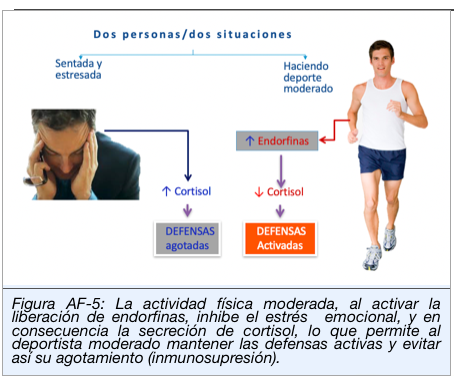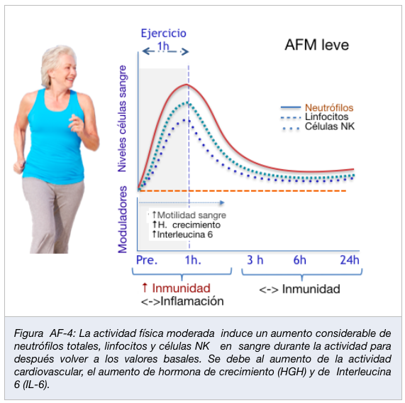 La consecuencia de todo ello es que la actividad física moderada induce un aumento considerables de neutrófilos, linfocitos y células NK en sangre mientras dura la actividad para después volver a los valores basales una vez terminada. En ello interviene un aumento de la actividad cardiovascular, de los niveles de hormona de crecimiento (HGH) y de la Interleucina 6 (IL-6) (Figura AF-4).