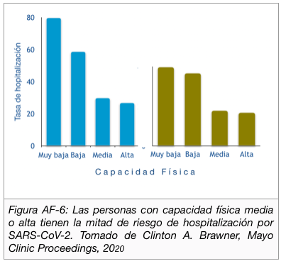Una muestra de la importancia que la actividad física tiene en la defensa frente a infecciones la tenemos en el trabajo recientemente publicado en Mayo Clinic Proceedings por Clinton A. Brawner y colaboradores, 2020. Como consecuencia de esta investigación, se concluye que las personas con capacidad física media o alta, como resultado de la actividad física que realizaban antes de la pandemia, tienen la mitad de riesgo de hospitalización por SARS-CoV-2 que aquellas que no han realizado actividad física.