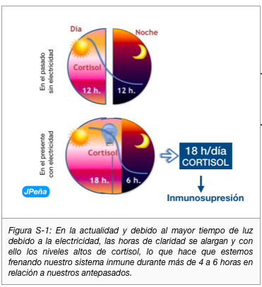 Esto repercute directamente sobre el sistema inmune de manera negativa debido a que como el cortisol tiene una función inmuno-supresora muy potente, lo que ocurre al alargarse el día es que suprimen las defensas más de las habitual que en nuestros antepasados (figura S-1 ).