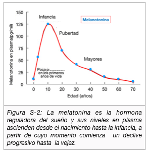 Quiero decir que si antes el día y la noche se repartían en periodos de 12 horas, ahora cambia de tal manera que el día le gana varias horas a la noche (Figura S-1). Esto ocurre de manera más llamativa en las personas mayores porque en ellos hay una pérdida progresiva de la capacidad de síntesis de la hormona melatonina por la pineal, de ahí que las personas mayores duermen menos horas que los adultos y jóvenes (Figura S-2 ).