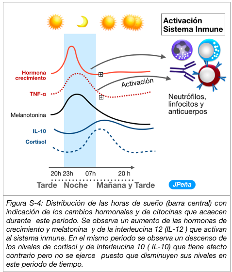Será después a primeras horas de la mañana cuando se active la secreción de cortisol y de IL-10, que al ser inmunosupresores tratan de compensar su hiperactividad anterior durante el sueño y preparar al organismo para la vida matutina. Además el cortisol hace aumentar los niveles de glucosa en sangre que se mantiene como combustible hasta las últimas horas de la tarde (Figura S-4).
