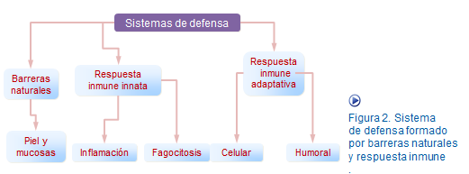 La acción defensiva del sistema inmune se articula a través de la respuesta inmune que es la manera de responder ante agresiones tanto externas como internas y se lleva a cabo de dos formas: respuesta innata y respuesta adaptativa, que actúan de manera coordinada (Figura: Tipos de respuesta inmune).