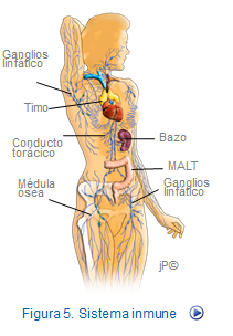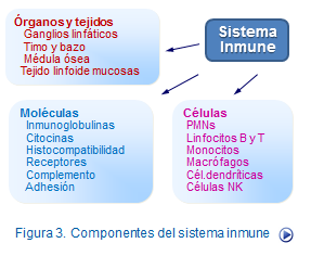 El sistema inmunológico se ubica en los órganos linfoides entre los que destacan el timo, médula ósea, bazo, ganglios linfáticos y tejidos linfoides asociados a mucosas. En estos órganos es donde se agrupan las células inmunocompetentes: linfocitos, monocitos, macrófagos, células dendríticas y NK. A su vez estas células interactúan entre sí y con las sustancias extrañas (antígenos) a través de múltiples receptores celulares y de las inmunoglobulinas (anticuerpos) (Figuras: componentes del Sistema inmune y Sistema inmune ).