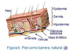 Efectivamente la piel representa casi el 20 % del peso corporal, consta de tres capas con funciones bien diferenciadas. La piel tiene capacidad impermeable y parcialmente antiséptica, gracias a la lubricación que aportan las glándulas sebáceas de los folículos pilosos, lo que impide que gérmenes patógenos penetren en el interior y provoquen infecciones (Figura: Piel).