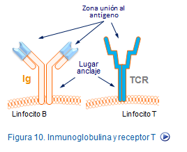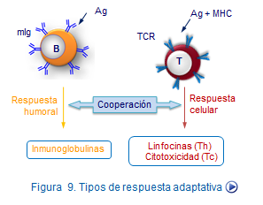 Este tipo de respuesta representa una tercera línea de defensa y se caracteriza por desarrollarse específicamente frente a las sustancias extrañas que la han inducido. Generalmente, estas sustancias son aquellas que no han sido previamente eliminadas por la respuesta innata. Los linfocitos que participan en esta respuesta son de dos tipos: linfocitos y linfocitos B, de ahí que existan dos modalidades de respuesta adaptativa, de tipo celular y de tipo humoral. En la primera intervienen los linfocitos T prioritariamente y en la segunda los linfocitos B, aunque ambos tipos de respuestas se complementan e interactúan (Figura: Activación linfocitos).