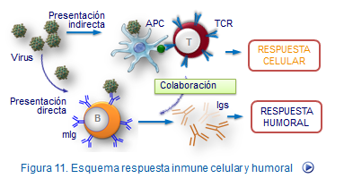 La respuesta inmune celular cubre una importante función en la defensa, actuando frente a virus y células tumorales. antígenos a través de sus receptores T (TCR) cuando son presentados por células que exponen sus determinantes antigénicos (péptidos) junto con las moléculas de histocompatibilidad (HLA) (Figura: Respuesta celular y humoral). Las moléculas de histocompatibilidad (HLA, en humanos) son glicoproteínas presentes en las membranas de la mayoría de las células nucleadas y son esencialmente de dos tipos, I y II.