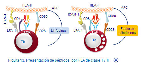 Los linfocitos que intervienen en este tipo de respuesta son de tipo Th y Tc. Los linfocitos Tc reconocen las moléculas HLA de clase I, mientras que los linfocitos Th lo hacen por moléculas HLA de clase II (Figura: Activación Th y Tc).