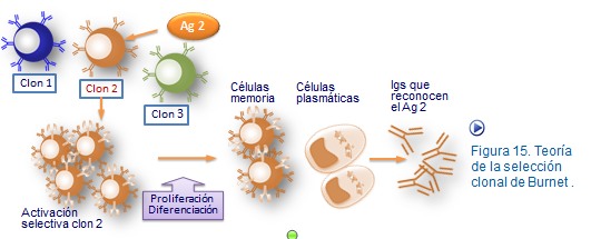 Especificidad. Es el fenómeno mediante el cual los péptidos que componen a cada antígeno son reconocidos exclusivamente por un solo tipo de receptor. Esto quiere decir que debe de existir el mismo número de receptores distintos como antígenos posibles. De esta manera, el organismo posee un número extraordinariamente grande de los receptores posibles, ya sean inmunoglobulinas (en el caso de los linfocitos B), o TCRs (en el caso de los linfocitos T). linfocitos para un antígeno determinado. Este fenómeno fue originalmente descrito por Burnet, por lo que hoy se conoce como la teoría de selección clonal de Burnet (Figura Selección clonal).