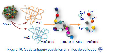 Sabemos que prácticamente cualquier tipo de molécula biológica, incluyendo lípidos, hormonas, carbohidratos complejos, fosfolípidos, ácidos nucleicos y proteínas pueden actuar como antígenos. Las múltiples partes del antígeno que pueden actuar induciendo la respuesta inmune son generalmente péptidos pequeños y se conocen como grupos determinantes ó epítopos (Figura: Ag-Ac).