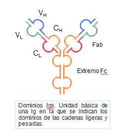 La cadena H tiene un dominio en la región variable (VH) y tres o cuatro en la constante, dependiendo de la clase de inmunoglobulina que consideremos (3 en la IgG, IgA e IgD y 4 en las IgM e IgE).