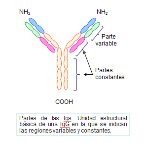 La parte constante de estas cadenas es diferente según la clase de inmunoglobulina que consideremos. Así, estas cadenas pueden ser de tipo: γ, α, μ, δ y ε, que definen a su vez las cinco clases de inmunoglobulinas: IgG, IgA, IgM, IgD e IgE respectivamente. (Figura: Cadenas Igs).