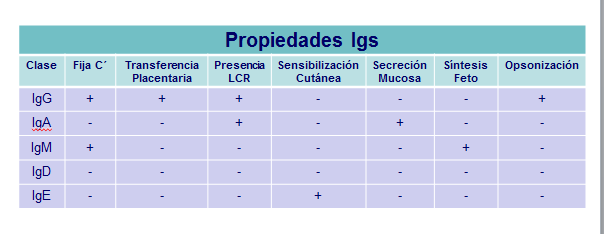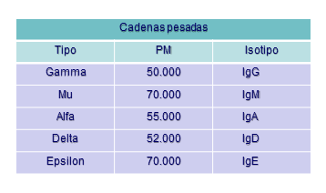 Las cadenas pesadas son las responsables de las propiedades biológicas, tales como la capacidad de unirse entre sí, fijar complemento, fijar la pieza de secreción y unirse a macrófagos, neutrófilos y células NK. Incluso entre moléculas de una misma clase existen diferencias en función de la subclase a la que pertenezcan.(Tabla: Características Igs).