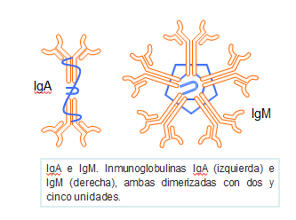 Las inmunoglobulinas pueden estar constituidas por unidades básicas simples, como es el caso de la IgG, IgD e IgE; en forma de dímeros (dos unidades básicas unidas), como es el caso de la IgA, o incluso formadas por hasta cinco estructuras básicas unidas por sus extremos Fc como es el caso de la IgM (Figura: Pentámero IgM).