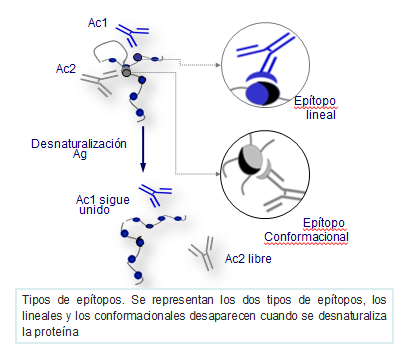 Los epítopos de un antígeno pueden estar formados por aminoácidos consecutivos de la proteína (epítopos lineales) o por zonas de confluencia (epítopos conformacionales) de varias cadenas (Figura: Tipos de epítopos).