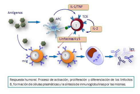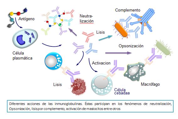 Son las principales sustancias responsables de la respuesta inmune humoral y su correcto funcionamiento es esencial para la defensa frente a microbios. Su carencia hace que el individuo muera por infecciones si no se instaura un tratamiento adecuado y a tiempo.Las inmunoglobulinas son glicoproteínas que se producen por los linfocitos B o sus células derivadas, las células plasmáticas. En el organismo se pueden encontrar de dos formas: A. Soluble en líquidos biológicos, donde actúan neutralizando y colaborando en la destrucción de antígenos y B. Unidas a la membrana de los linfocitos B que las producen, donde actúan como receptores de antígenos.