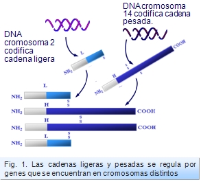 Todo esto se conoció por los estudios realizados por Tonegawa en 1976, en los que además se demostró que la síntesis de las cadenas ligeras y pesadas se regula por genes que se encuentran en cromosomas distintos (Figura: Genes). Esto fue puesto de manifiesto empleando técnicas de digestión enzimática del DNA de células B y posterior hibridación con sondas de DNA complementario (cDNA), mediante la técnica de Southern Blot (ver capítulo sobre Métodos). Mediante esta técnica, se pudo observar que las sondas marcaban de manera distinta si se aplicaban en células inmaduras que cuando se hacía en células maduras.