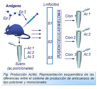 Cuando un antígeno induce la producción de anticuerpos se forman una gran variabilidad de éstos frente a cada uno de los diferentes epítopos del antígeno. Por ello decimos que estos anticuerpos son policlonales debido a que son muchos y muy diversos clones linfocitarios los que se activan y diferencian (Figura: Producción AcMo). Este fenómeno es de gran utilidad biológica ya que ofrecen una amplia barrera de protección del organismo.