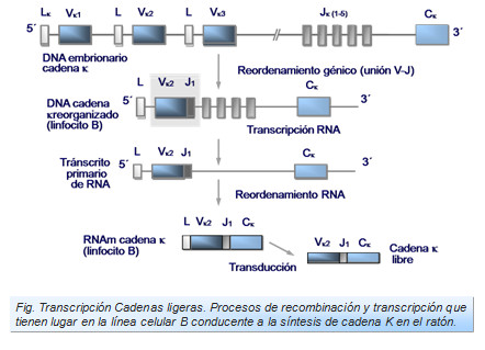 Así pues, en el proceso de recombinación de los genes de cadenas ligeras en cada uno de los linfocitos se acopla un segmento V con un segmento J. Estos a su vez se recombinan con el segmento correspondiente a la parte constante C. El proceso de transcripción se hace de tal manera que el RNA mensajero contiene información secuenciada V, J y C y no del resto se segmentos existentes en el DNA embrionario (Figura: Transcripción cadenas ligeras).