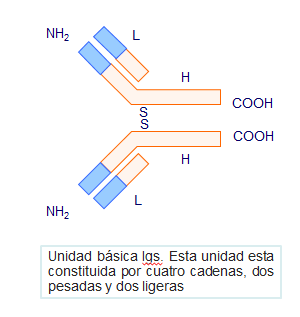Las inmunoglobulinas están formadas por cuatro cadenas polipeptídicas. Dos son de mayor tamaño y se denominan cadenas pesadas, y dos, de menor tamaño y se denominan cadenas ligeras. Las cadenas ligeras y pesadas se agrupan de tal manera que existe una proximidad espacial entre los cuatro extremos amínicos por una parte, y los extremos carboxílicos por otra. Las inmunoglobulinas pueden ser fraccionadas mediante la utilización de enzimas (papaína, pepsina, etc.), obteniéndose diferentes tipos de fragmentos. Esto permitió no sólo conocer la estructura de estas moléculas sino también deducir la función de cada una de sus partes (Figura: Estructura unidad básica).