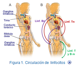 En general los linfocitos maduros abandonan el timo (linfocitos T) o la médula (linfocitos B) y migran hacia los ganglios linfáticos y bazo en donde se almacena transitoriamente a la espera de la llegada de los antígenos. Sin embargo, pueden retornan al torrente circulatorio de manera espontanea o después de ser estimulados. Este fenómeno se conoce como recirculación de linfocitos y es consecuencia, de la expresión diferencial de moléculas de adhesión en los leucocitos, por una parte, o en el endotelio de los vasos y tejidos influenciados por la presencia de moléculas de adhesión y quimiocinas (figura: Tráfico de leucocitos).