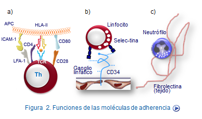 Estas moléculas se encuentran en la superficie de los leucocitos, endotelios y otras células y hacen posible la adhesión de unos leucocitos con otros, lo que permite la comunicación entre leucocitos, fenómeno indispensable en la generación de la respuesta inmune y los fenómenos de citotoxicidad. Por otra parte también es importante la movilidad de los leucocitos, para lo cual es importante su unión a las células endoteliales de los vasos o a componentes de la matriz extracelular. (ver etiqueta I: moléculas de adherencia).