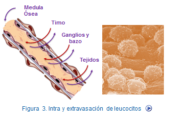 Como consecuencia, los leucocitos migran hacia otros tejidos y órganos abandonando el torrente sanguíneo siguiendo un patrón que es equivalente para neutrófilos, monocitos y linfocitos (Figura: Migración a través de endotelios).