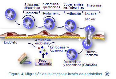 Por último, se produce la extravasación de leucocitos y posterior migración de los mismos a través del tejido circundante. Esto implica que ocurran fenómenos de adhesión dinámicos que permitan el movimiento de la célula a otros tejidos. No se conoce con precisión el mecanismo de la extravasación y migración de leucocitos, pero las integrinas α4/β1, α5/β1 y LFA‑1, así como las moléculas CD44 y CD31 parecen estar involucradas.
