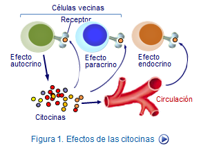 Las citocinas ejercen un efecto autocrino cuando se unen a receptores presentes en la propia célula que las produce y paracrino, cuando actúan sobre células que se encuentran en su vecindad. Sólo a veces actúan a distancia, al igual que lo hacen las hormonas. (Figura: Efectos citocinas).