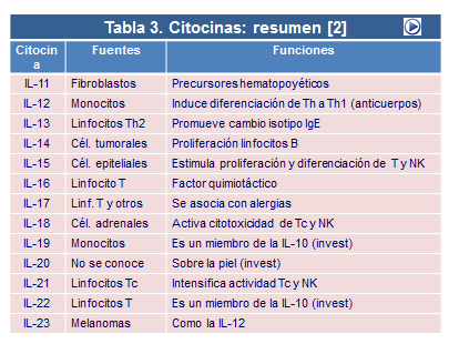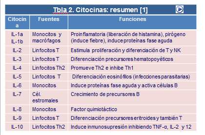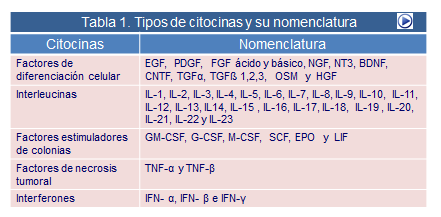 La mayoría de las citocinas se pueden agrupan en cinco familias (Tablas: Citocinas, Citocinas: resumen 1 y 2):