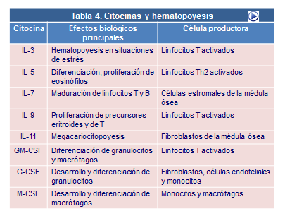 Comprenden un grupo amplio de citocinas que son producidas por células del estroma de la médula ósea o por linfocitos maduros activados. Tienen como función la de promover el crecimiento y diferenciación de células, en su mayoría inmunocompetentes, a partir de células inmaduras (Tabla: Citocinas y hematopoyesis). Entre ellas destacan: