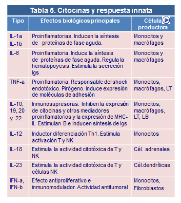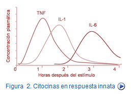 Estas citocinas se producen de forma inmediata después del contacto de las células implicadas en la respuesta inmune innata con un agente extraño. Los monocitos y macrófagos activados son la principal fuente de estas moléculas, aunque también pueden ser producidas por linfocitos activados y otras células no pertenecientes al sistema inmune, como células endoteliales y fibroblastos (Tabla: Citocinas y respuesta innata).