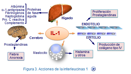 IL-1. Es producida mayoritariamente por monocitos y macrófagos. Existen dos formas, IL-1alfa e IL-1 beta que, aunque tienen poca homología en su secuencia de aminoácidos, comparten el mismo receptor y ejercen efectos biológicos similares. La IL-1 posee efectos pro- inflamatorios debido a que induce la liberación de histamina por los mastocitos, generando vasodilatación y aumento de la permeabilidad vascular en el lugar donde se produce. Es el principal pirógeno endógeno, induciendo fiebre a través de la producción de prostaglandinas. También promueve la síntesis de proteínas de fase aguda por los hepatocitos y actúa sobre el SNC induciendo sueño y cansancio, típicamente asociados con los procesos infecciosos (Figura: IL-1).