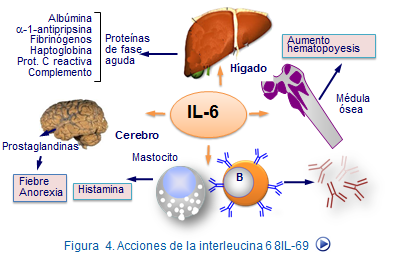 IL-6. Es producida por monocitos y macrófagos, fibroblastos, células endoteliales, linfocitos T y células del estroma de la médula ósea. Tambien en el músculo cuando se relaiza ejericio. Junto con la IL-1, la Il-6 es la principal inductora de la síntesis de proteínas de fase aguda, sobre todo de fibrinógeno. Además posee efectos pro-inflamatorios (aunque en ciertas circunstnacias fuera dele proceso inflmaoiro se le atribuye efectos antiimmatoiros) y se ha observado que promueve la diferenciación de linfocitos B hacia células plasmáticas, producción de inmunoglobulinas y facilita la maduración de precursores hematopoyéticos dependientes de la IL-3 (Figura: IL-6).