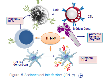 IFN-gamma. Es producido por linfocitos Th1, Tc y por células NK. Además de su efecto antiviral posee una importante actividad inmunomoduladora. Incrementa la expresión de antígenos de HLA de clase I y II en varios tipos celulares, lo que facilita su función presentadora de Ag y activa a los macrófagos, incrementando su capacidad de defensa contra las infecciones. También se sabe que actúa de forma autocrina sobre las propias células NK que lo producen, aumentando su actividad citolítica y, como consecuencia, incrementando su efecto antitumoral. Inhibe la proliferación de linfocitos Th2, de manera que su presencia durante la estimulación antigénica induce la diferenciación de linfocitos T hacia células efectoras tipo Th1 favoreciendo, por lo tanto, el desarrollo de las respuestas inflamatorias (Figura: IFN-y).