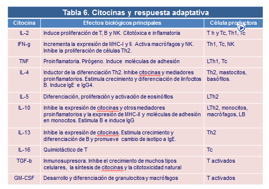 En respuesta a una estimulación antigénica, los linfocitos T se activan, proliferan y se diferencian hacia células efectoras específicas. Estas células ejercen sus funciones produciendo una serie de moléculas solubles, que son los verdaderos artífices de los mecanismos efectores de la respuesta inmune adaptativa (Tabla: Citocinas y respuesta adaptativa).