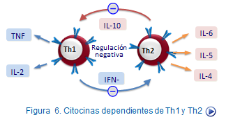 Los linfocitos Th0, como consecuencia de una estimulación antigénica, pueden diferenciarse hacia linfocitos T cooperadores de tipo Th1 o Th2, estando esta diferenciación en parte condicionada por las citocinas que se encuentran en el medio. Así, la presencia de IL-12 promueve la diferenciación hacia Th1, mientras que la IL-4 condiciona el desarrollo Th2. Los linfocitos Th1, en colaboración con los macrófagos, están implicados en la respuesta inmune celular, mientras que los Th2 promueven la respuesta inmune humoral.