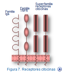 Las citocinas ejercen su efecto biológico a través de su unión a receptores específicos expresados en la superficie de las células sobre las que actúan. Estos receptores son proteínas de membrana glicosiladas que constan de una región extracitoplasmática de unión con la citocina, una región transmembrana y una región citoplasmática que interviene en la transmisión de señales a la célula.