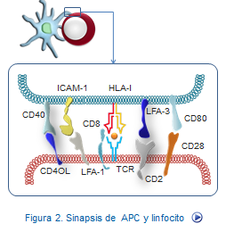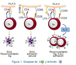 moléculas es la contribuir al desarrollo de una respuesta inmune efectiva, facilitando la interacción entre las distintas células. Se forma así lo que se denomina sinapsis entre linfocitos T y célula presentadora de antígeno portadoras de las moléculas HLA (Figura, requerimiento activación).