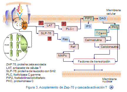 de acoplamiento donde se une a la proteína citoplásmica ZAP‐70, que pertenecen a la familia de enzimas proteincinasas. Ejerce así el ZAP‐70, que se encuentra tanto en células T como NK, un papel crítico en la cascada de señalización intracelular fosforizando nuevos substratos (Figura, fosforilación ITAM).