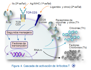 Los linfocitos T, al igual que los linfocitos B, poseen mecanismos a través de los cuales los estímulos externos son procesados y enviados al núcleo mediante mediadores bioquímicos intracelulares conocidos como segundos mensajeros. Estos mediadores son capaces de inducir la transcripción específica de un amplio número de genes, que participan en los procesos de proliferación y diferenciación celular. Esta cadena de segundos mensajeros interviene señales procedentes tanto del TCR/CD3 como de otras moléculas que participan en la interacción celular y receptores de citocinas presentes en la membrana de los linfocitos (Figura, cascada activación).