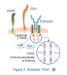 Uno de los primeros eventos bioquímicos que ocurren en los linfocitos T después de la interacción HLA-péptido-TCR, es la fosforilación en tirosina, principalmente de las cadenas zeta no polimórficas del CD3. Estas cadenas poseen en sus dominios intracitoplasmáticos unas regiones denominadas ITAM (Immunoreceptor Tyrosine‐based Activation Motifs) que se fosforilan por la acción de las tirosina cinasas c‐lck y c‐fyn.