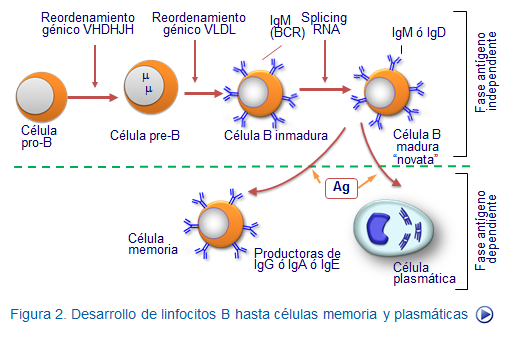 Los linfocitos B se forman a partir de progenitores linfoides derivados de las células hematopoyéticas primordiales (HSC) mediante lo qeu se viene en denominar linfopoyesis B. En este proceso, que ocurre en la médula ósea, además de reordenarse los genes de las inmunoglobulinas, se produce la selección del repertorio de linfocitos B no autorreactivos eliminándose aquellos clones que reconocen antígenos propios (Figura desarrollo B).