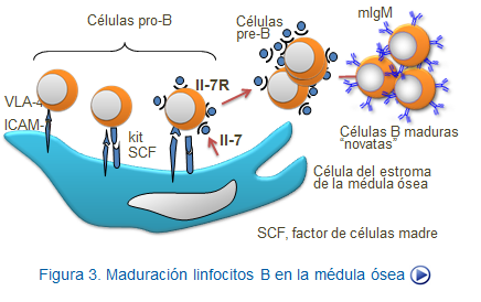 Para la maduración de estos linfocitos B en la médula ósea y su correcto reordenamiento de los Igs, se requiere de la presencia de células estromales que interactúan con los linfocitos inmaduros y les ayudan con la IL‐7 que producen. La interacción entre célula estromal y célula B se lleva a cabo con la participación de las moléculas VLA‐4 y su ligando VCAM‐1, presentes en células B y estromales, respectivamente. En ello también participa la molécula c‐Kit, presente en los linfocitos y que interactúa con el factor de células madre o SCF, presente en las células estromales (Figura, Linfopoyesis B).