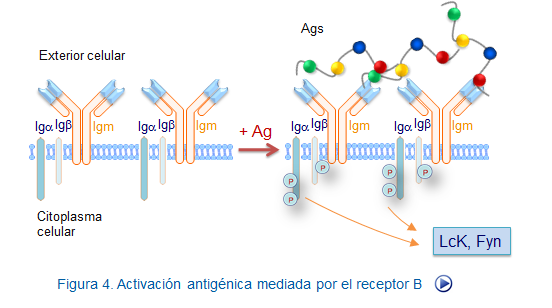 Las inmunoglobulinas de membrana (mIgs) actúan reconociendo y uniéndose a los antígenos mientras que la transmisión de señales se hace con ayuda de las moléculas Ig‐alfa e Ig‐beta que se encuentran asociadas a las mIgs y en su conjunto constituye el receptor simple de los linfocitos B (BCR simple) (Figura, activación BCR).