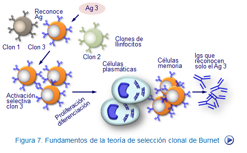 No todos los linfocitos, tanto B como T, se activan frente a un antígeno determinado, sino que lo hacen sólo aquellos (clonos) que poseen el receptor adecuado para dicho antígeno (Figura, selección clonal).Esto se debe a que los receptores de los linfocitos, tanto TCR como mIgs, están distribuidos clonalmente, esto es, cada uno de los diversos tipos de linfocitos sólo reconocería y en consecuencia se estimularía por un determinado tipo de antígeno. En el caso concreto, por ejemplo, de los linfocitos B, tras el contacto con el antígeno, los linfocitos B se activarían y diferencian a células secretoras de inmunoglobulinas, las cuales tienen una especificidad casi idéntica, a la expresada en la membrana de las células B que originariamente reconocieron al antígeno.