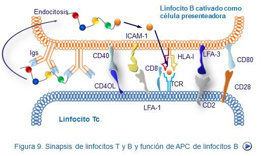 El proceso es como sigue, los linfocitos B reconocen a través de su Ig de membrana antígenos y lo internalizan junto con el Ig de membrana. Este antígeno es entonces procesado en el interior del linfocito B y posteriormente puede ser expuesto por las moléculas HLA a los receptores de los linfocitos T (TCR-CD3).
