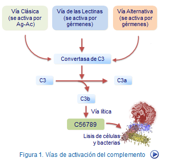 La activación del complemento puede iniciarse de tres formas distintas dando lugar, a su vez, a tres formas diferetnes de reacciones y que se conocen como vía clásica, vía alternativa y vía de las las lectinas Todas estas formas confluyen en una única ruta final conocida como vía lítica (Figura 2).