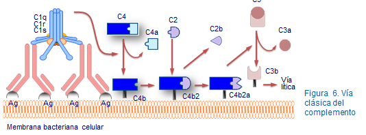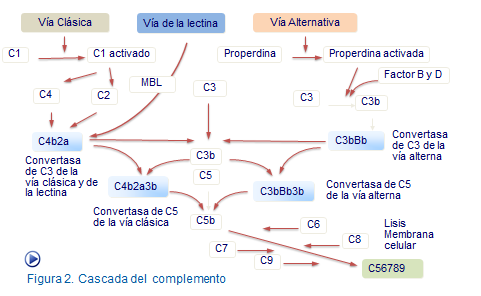 La activación del complemento implica cambios en ciertos componentes que dan lugar a reacciones en cadena, de forma que se van generando productos activos que tienen acciones biológicas importantes en la defensa del organismo. Todo ello debido a que muchos de los factores del complemento son enzimas con carácter proteolítico (Figura 1).