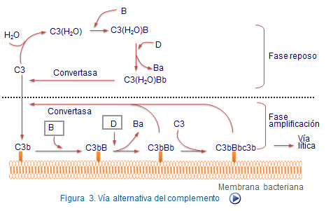 El primer factor de esta vía, es el C3, que se está activado permanentemente pero a nivels muy moderados (fase de reposo). La activación y amplificación ocurren solamente en presencia de ciertos agentes, principalmente bacterias (fase de ampliación).